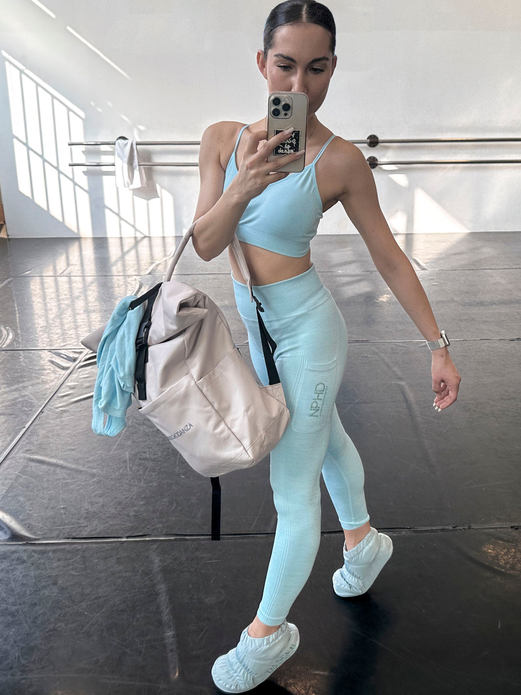 - Tasca sulla gamba con stampa logo glitter.