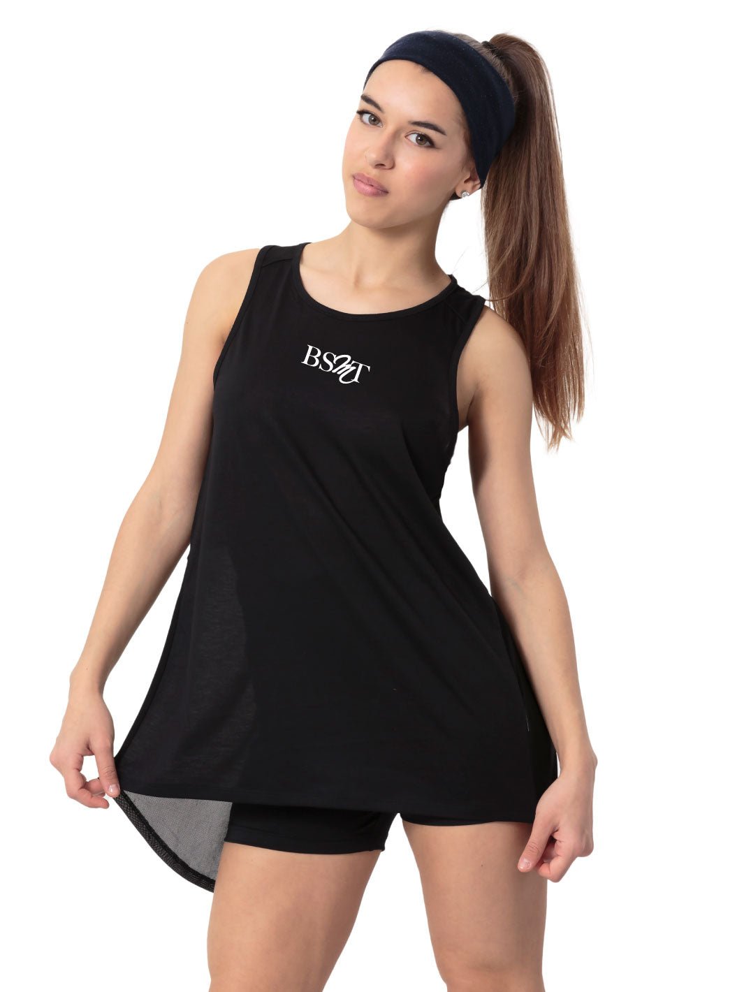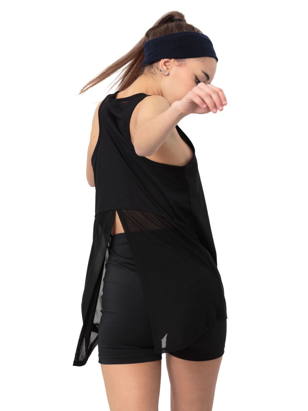 • Top tank in morbidissimo poliestere con rete trasparente a metà schiena con taglio.