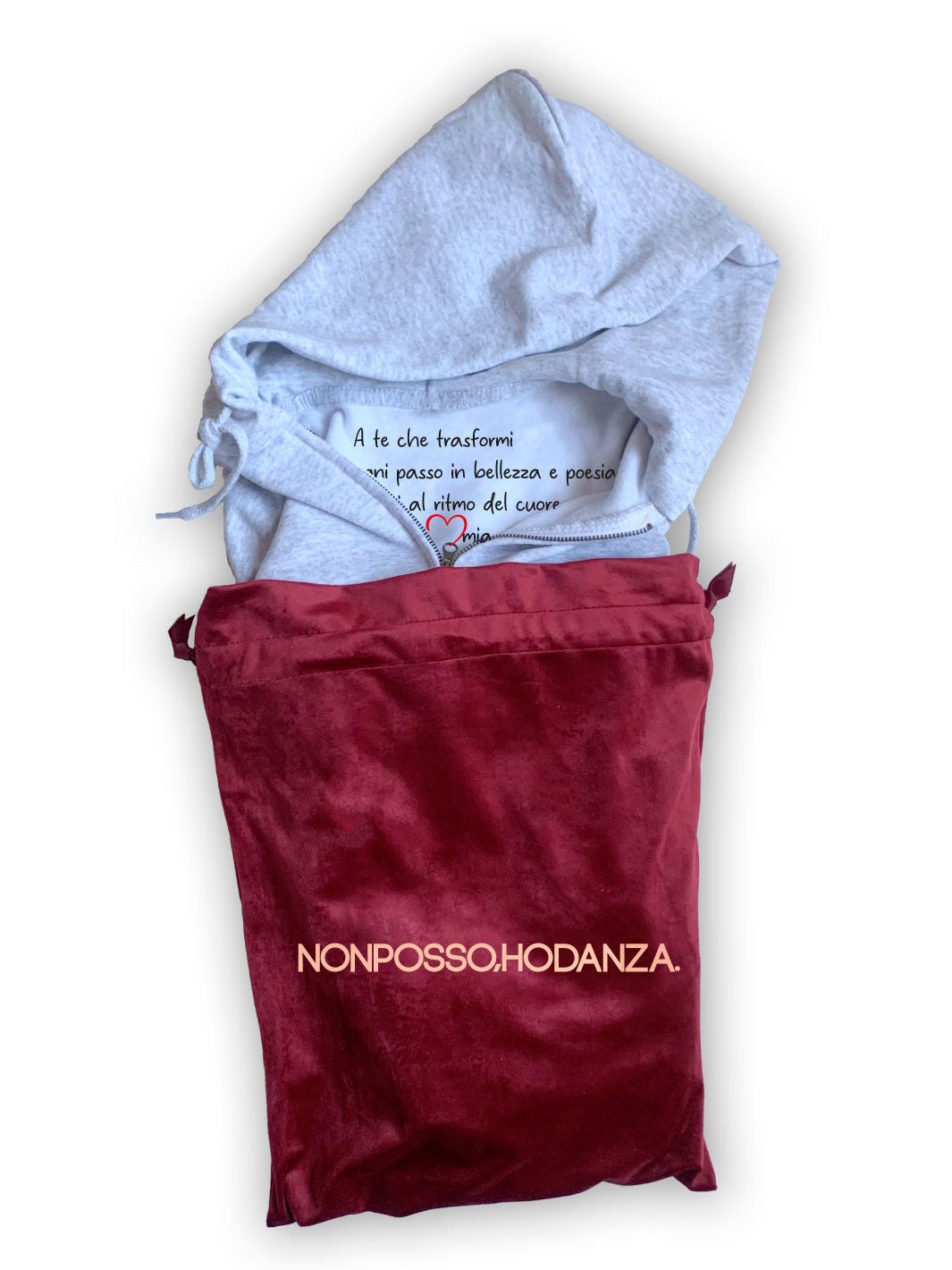 La felpa verrà consegnata all'interno della back pack in velluto colore rosso San Valentino.